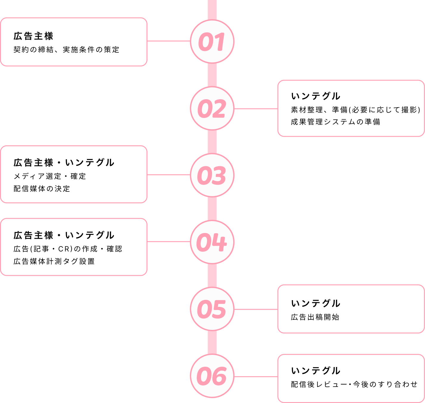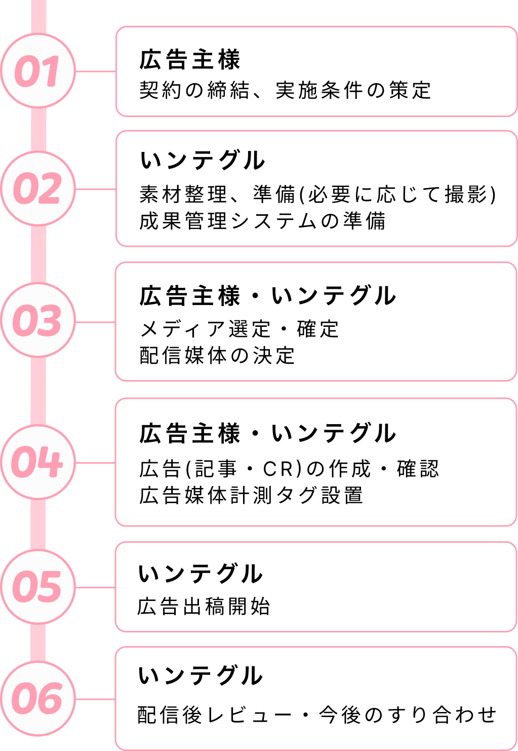 基盤を作りたい広告主にも伴走します。アフィリエイトを取り組んだことが無くても、必要な条件・撮影・素材の用意・記事・CR作成など代行いたします。KPIを設定し、定期的なレビューも可能です。